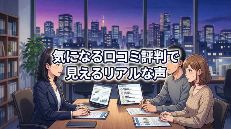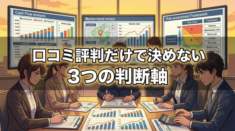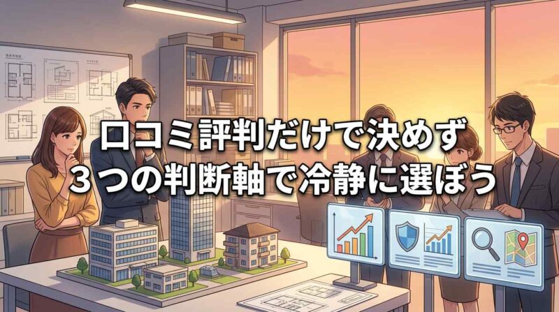 口コミは参考情報にとどめ、物件ごとの割高度・立地・出口戦略で判断するのが鉄則です。アフィリエイト提携先のサイトは他社への誘導バイアスが入る点に注意しましょう。判断軸は3つの判断軸のH2で解説しています。